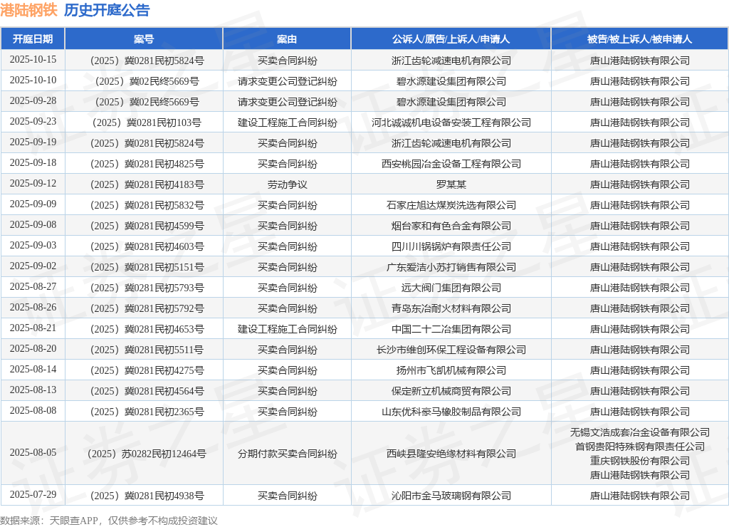 案号:(2025)冀0281民初4825号根据统计,近一年内以唐山港陆钢铁有限公司为当事人的历史开庭公告有63则,其中案由为“买卖合同纠纷”的公告以36则居首,其次为“合同纠纷”有5则,“劳务合同纠纷”有4则。历史开庭公告(前20条)如下:
