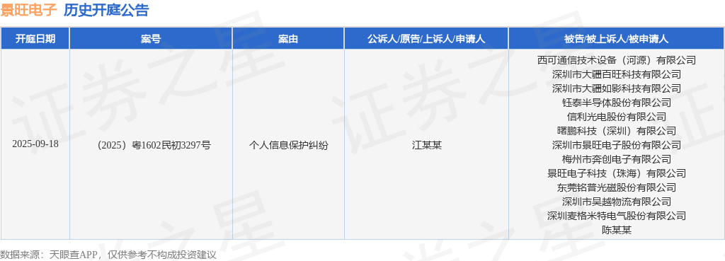 根据统计,近一年内以深圳市景旺电子股份有限公司为当事人的历史开庭公告有1则,其中案由为“个人信息保护纠纷”的公告以1则居首。历史开庭公告如下: