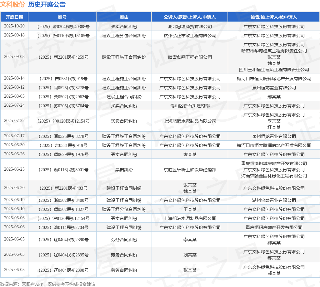 案号:(2025)浙0110民初15105号根据统计,近一年内以广东文科绿色科技股份有限公司为当事人的历史开庭公告有130则,其中案由为“建设工程施工合同纠纷”的公告以44则居首,其次为“买卖合同纠纷”有18则,“劳务合同纠纷”有16则。历史开庭公告(前20条)如下: