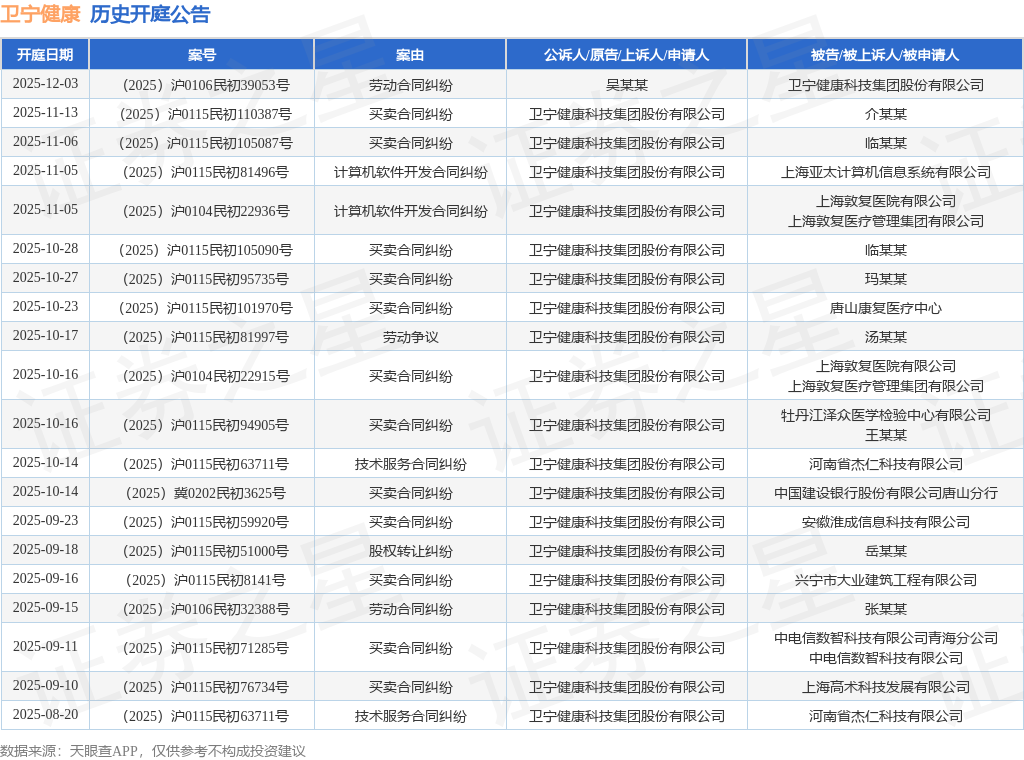 案号:(2025)沪0115民初51000号根据统计,近一年内以卫宁健康科技集团股份有限公司为当事人的历史开庭公告有67则,其中案由为“买卖合同纠纷”的公告以34则居首,其次为“劳动合同纠纷”有12则,“劳动争议”有4则。历史开庭公告(前20条)如下: