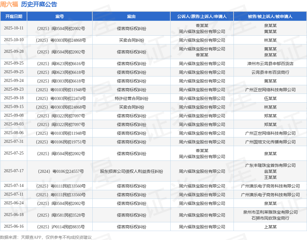 案号:(2025)粤0303民初22474号根据统计,近一年内以周六福珠宝股份有限公司为当事人的历史开庭公告有47则,其中案由为“侵害商标权纠纷”的公告以33则居首,其次为“合同纠纷”有3则,“商标行政纠纷”有3则。历史开庭公告(前20条)如下: