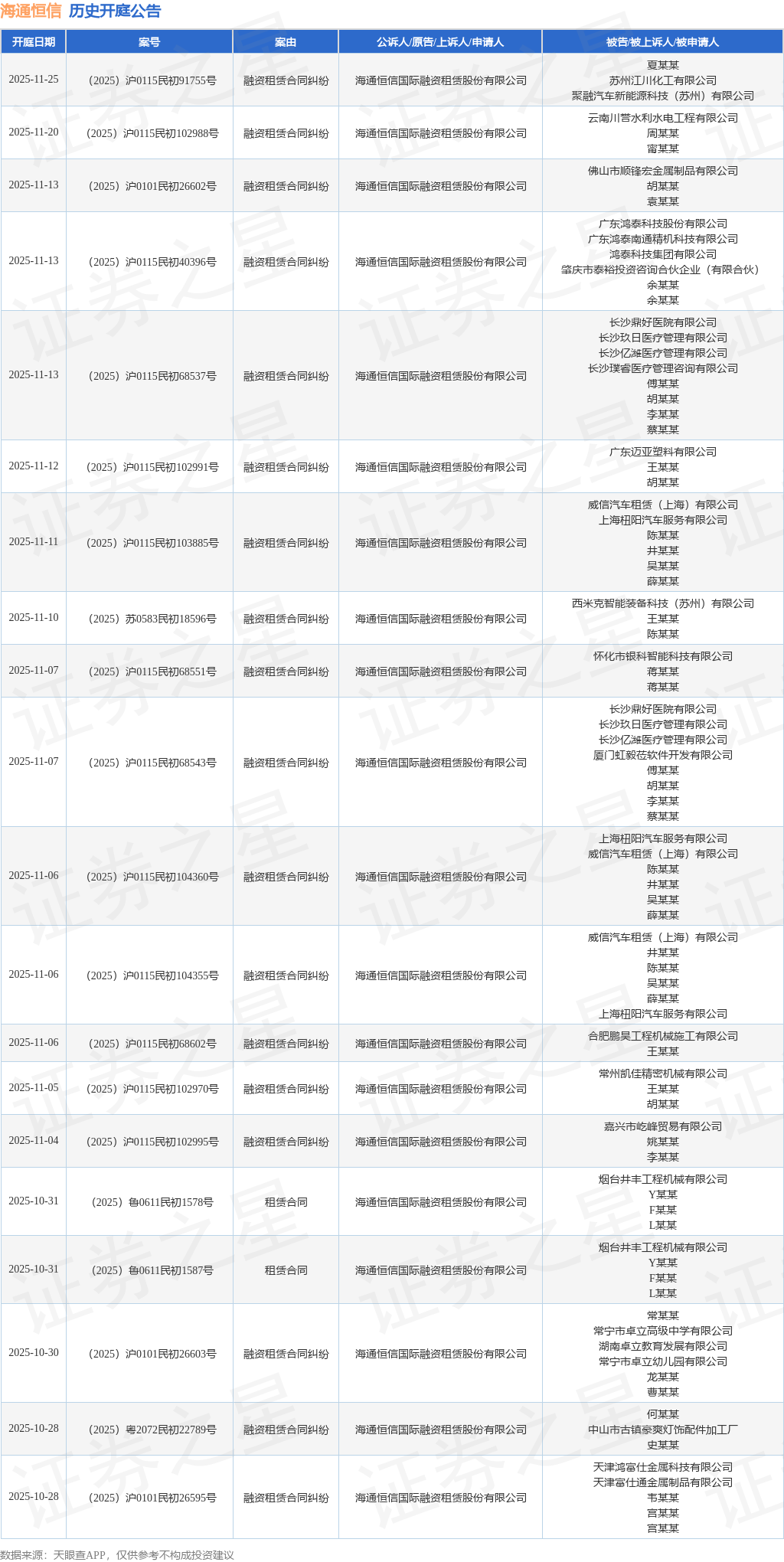 案号:(2025)沪0101民初21554号根据统计,近一年内以海通恒信国际融资租赁股份有限公司为当事人的历史开庭公告有1620则,其中案由为“融资租赁合同纠纷”的公告以1480则居首,其次为“申请实现担保物权”有54则,“合同纠纷”有21则。历史开庭公告(前20条)如下: