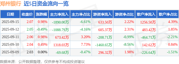 证券之星消息,截至2025年9月15日收盘,郑州银行(002936)报收于2.07元,上涨0.98%,换手率2.07%,成交量138.39万手,成交额2.86亿元。