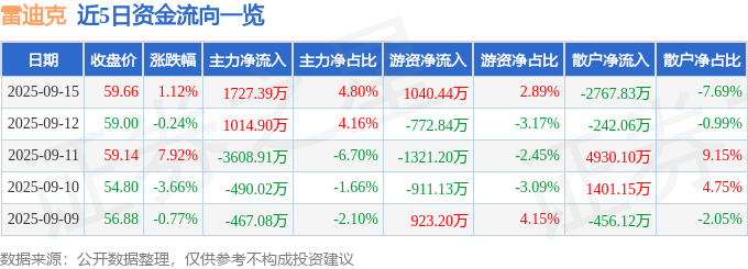 证券之星消息,截至2025年9月15日收盘,雷迪克(300652)报收于59.66元,上涨1.12%,换手率4.97%,成交量5.94万手,成交额3.6亿元。