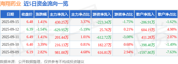 证券之星消息,截至2025年9月15日收盘,海翔药业(002099)报收于6.48元,上涨1.41%,换手率1.23%,成交量19.87万手,成交额1.28亿元。