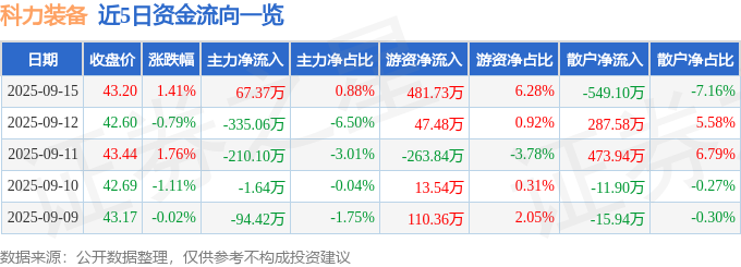 证券之星消息,截至2025年9月15日收盘,科力装备(301552)报收于43.2元,上涨1.41%,换手率7.43%,成交量1.77万手,成交额7672.72万元。