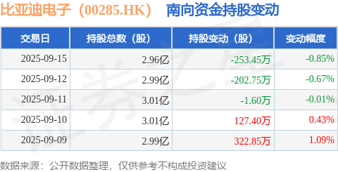 证券之星消息,9月15日南向资金减持253.45万股比亚迪电子(00285.HK)。近5个交易日中,获南向资金减持的有3天,累计净减持7.55万股。近20个交易日中,获南向资金增持的有10天,累计净增持3555.23万股。截至目前,南向资金持有比亚迪电子(00285.HK)2.96亿股,占公司已发行普通股的13.14%。