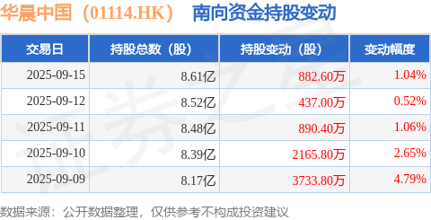 证券之星消息,9月15日南向资金增持882.6万股华晨中国(01114.HK)。近5个交易日中,获南向资金增持的有5天,累计净增持8109.6万股。近20个交易日中,获南向资金减持的有8天,累计净减持5689.0万股。截至目前,南向资金持有华晨中国(01114.HK)8.61亿股,占公司已发行普通股的17.05%。