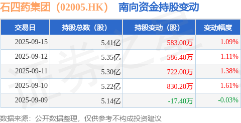 证券之星消息,9月15日南向资金增持583.0万股石四药集团(02005.HK)。近5个交易日中,获南向资金增持的有4天,累计净增持2704.2万股。近20个交易日中,获南向资金增持的有13天,累计净增持5350.8万股。截至目前,南向资金持有石四药集团(02005.HK)5.41亿股,占公司已发行普通股的18.33%。