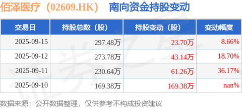 证券之星消息,9月15日南向资金增持23.7万股佰泽医疗(02609.HK)。截至目前,南向资金持有佰泽医疗(02609.HK)297.48万股,占公司已发行普通股的0.21%。