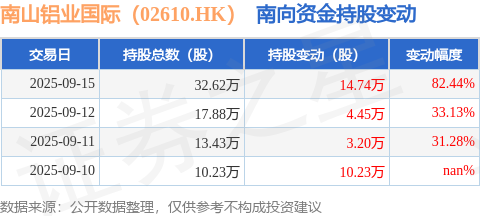 证券之星消息,9月15日南向资金增持14.74万股南山铝业国际(02610.HK)。截至目前,南向资金持有南山铝业国际(02610.HK)32.62万股,占公司已发行普通股的0.05%。