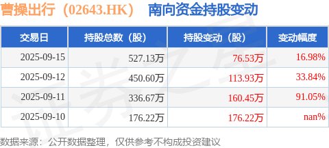 证券之星消息,9月15日南向资金增持76.53万股曹操出行(02643.HK)。截至目前,南向资金持有曹操出行(02643.HK)527.13万股,占公司已发行普通股的0.96%。