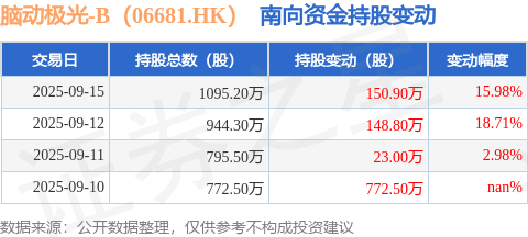证券之星消息,9月15日南向资金增持150.9万股脑动极光-B(06681.HK)。截至目前,南向资金持有脑动极光-B(06681.HK)1095.2万股,占公司已发行普通股的0.85%。