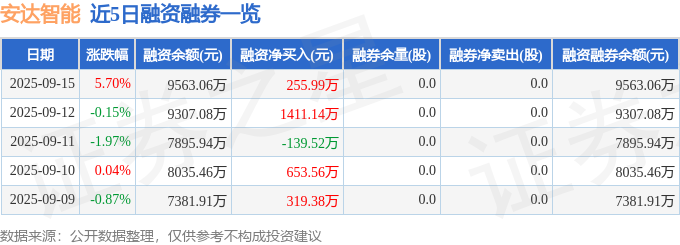 安达智能融资融券信息显示,融资方面,当日融资买入961.86万元,融资偿还705.87万元,融资净买入255.99万元。融券方面,融券卖出0.0股,融券偿还0.0股,融券余量0.0股,融券余额0.0万元。融资融券余额9563.06万元。
