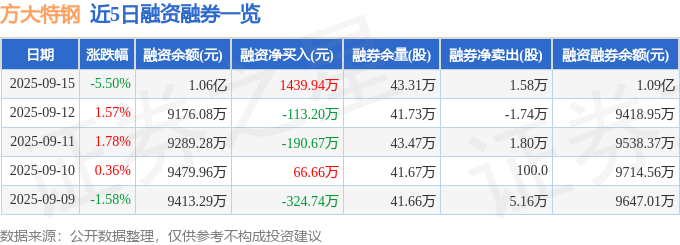 证券之星消息,截至2025年9月15日收盘,方大特钢(600507)报收于5.5元,下跌5.5%,换手率2.49%,成交量57.58万手,成交额3.2亿元。