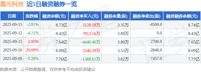 嘉元科技融资融券信息显示,融资方面,当日融资买入1.73亿元,融资偿还1.41亿元,融资净买入3128.18万元。融券方面,融券卖出800.0股,融券偿还5300.0股,融券余量3.35万股,融券余额108.96万元。融资融券余额8.74亿元。