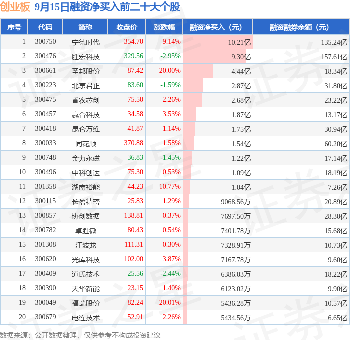 创业板融资净买入前三分别为:宁德时代(300750)融资净买入10.21亿元、胜宏科技(300476)融资净买入9.3亿元、圣邦股份(300661)融资净买入4.44亿元,前20具体见下表: