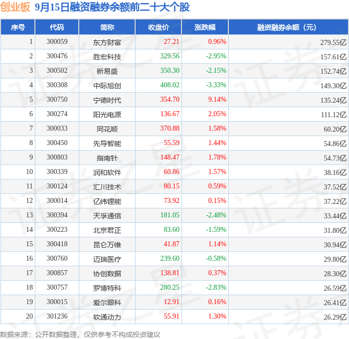 创业板融资融券余额前三分别为:东方财富(300059)融资融券余额279.55亿元、胜宏科技(300476)融资融券余额157.61亿元、新易盛(300502)融资融券余额152.74亿元,前20具体见下表: