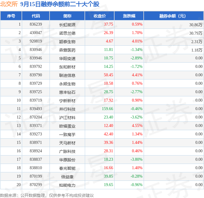 北交所融券余额前三分别为:长虹能源(836239)融券余额30.86万元、诺思兰德(430047)融券余额30.79万元、颖泰生物(920819)融券余额2.31万元,前20具体见下表: