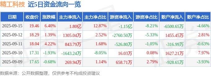 证券之星消息,截至2025年9月15日收盘,精工科技(002006)报收于19.46元,上涨6.4%,换手率13.75%,成交量71.48万手,成交额13.96亿元。