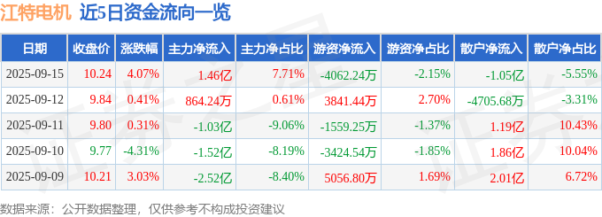 证券之星消息,截至2025年9月15日收盘,江特电机(002176)报收于10.24元,上涨4.07%,换手率10.9%,成交量185.98万手,成交额18.89亿元。