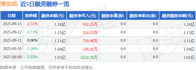 博实结融资融券信息显示,融资方面,当日融资买入3102.17万元,融资偿还2169.91万元,融资净买入932.25万元,连续3日净买入累计2007.78万元。融券方面,融券卖出0.0股,融券偿还0.0股,融券余量0.0股,融券余额0.0万元。融资融券余额1.24亿元。