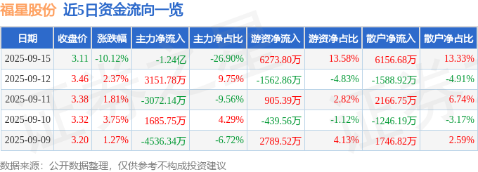 证券之星消息,截至2025年9月15日收盘,福星股份(000926)报收于3.11元,下跌10.12%,跌停,换手率9.25%,成交量145.52万手,成交额4.62亿元。