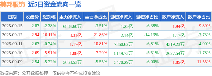 证券之星消息,截至2025年9月15日收盘,美邦服饰(002269)报收于2.87元,下跌2.38%,换手率25.66%,成交量644.69万手,成交额19.62亿元。