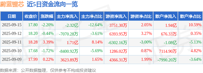 证券之星消息,截至2025年9月15日收盘,蔚蓝锂芯(002245)报收于17.8元,下跌2.2%,换手率9.35%,成交量101.41万手,成交额18.33亿元。