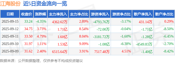 证券之星消息,截至2025年9月15日收盘,江海股份(002484)报收于33.24元,下跌4.35%,换手率5.53%,成交量45.38万手,成交额15.11亿元。