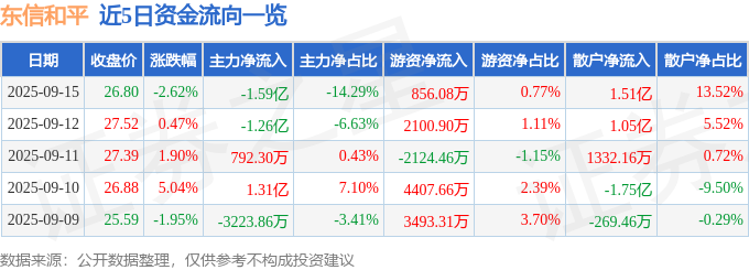 9月15日的资金流向数据方面,主力资金净流出1.59亿元,占总成交额14.29%,游资资金净流入856.08万元,占总成交额0.77%,散户资金净流入1.51亿元,占总成交额13.52%。