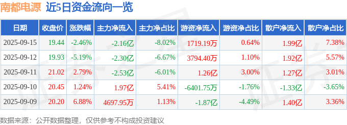 证券之星消息,截至2025年9月15日收盘,南都电源(300068)报收于19.44元,下跌2.46%,换手率15.81%,成交量134.86万手,成交额26.99亿元。