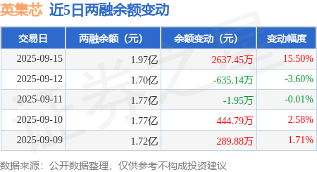 证券之星消息,9月15日,英集芯(688209)融资买入5206.04万元,融资偿还2588.03万元,融资净买入2618.01万元,融资余额1.96亿元,近20个交易日中有12个交易日出现融资净买入。