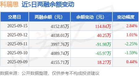 证券之星消息,9月15日,科瑞思(301314)融资买入261.15万元,融资偿还146.31万元,融资净买入114.84万元,融资余额4152.85万元。