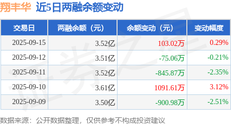证券之星消息,9月15日,翔丰华(300890)融资买入5094.91万元,融资偿还4991.89万元,融资净买入103.02万元,融资余额3.52亿元,近20个交易日中有12个交易日出现融资净买入。
