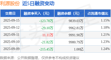 证券之星消息,9月15日,利源股份(002501)融资买入1124.24万元,融资偿还1248.01万元,融资净卖出123.78万元,融资余额9839.03万元。
