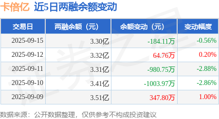 证券之星消息,9月15日,卡倍亿(300863)融资买入1131.6万元,融资偿还1315.71万元,融资净卖出184.11万元,融资余额3.3亿元。