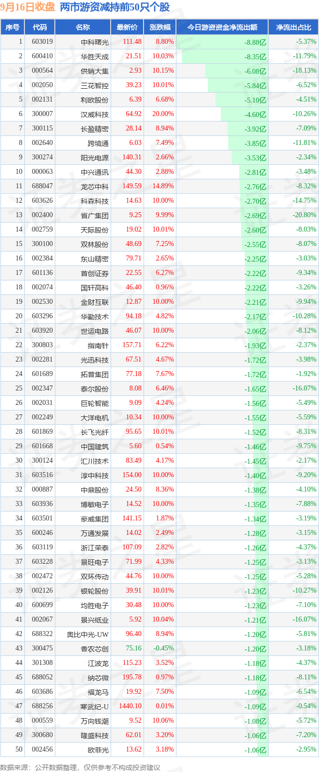 两市游资减持最多的前十只个股为: