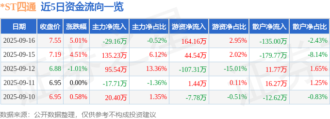 证券之星消息,截至2025年9月16日收盘,*ST四通(603838)报收于7.55元,上涨5.01%,换手率2.32%,成交量7.43万手,成交额5564.99万元。