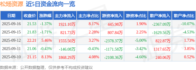 证券之星消息,截至2025年9月16日收盘,松炀资源(603863)报收于21.53元,下跌1.37%,换手率5.33%,成交量10.91万手,成交额2.35亿元。