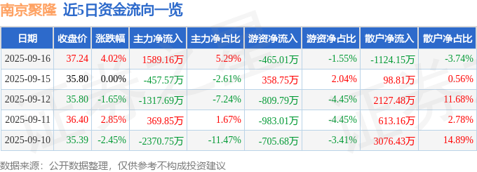 证券之星消息,截至2025年9月16日收盘,南京聚隆(300644)报收于37.24元,上涨4.02%,换手率9.33%,成交量8.2万手,成交额3.01亿元。
