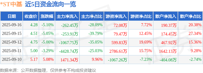 证券之星消息,截至2025年9月16日收盘,*ST中基(000972)报收于4.28元,下跌5.1%,换手率0.28%,成交量2.18万手,成交额934.2万元。