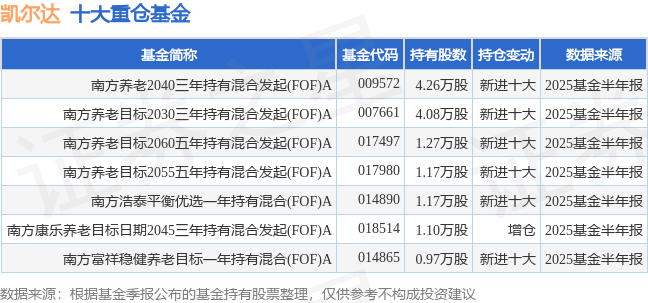 根据2025基金半年报公募基金重仓股数据,重仓该股的公募基金共7家,其中持有数量最多的公募基金为南方基金的南方养老2040三年持有混合发起(FOF)A。南方养老2040三年持有混合发起(FOF)A目前规模为0.65亿元,最新净值1.1257(9月11日),较上一交易日上涨1.66%,近一年上涨38.04%。该公募基金现任基金经理为鲁炳良。鲁炳良在任的基金产品包括:南方养老2035三年持有混合(FOF)A,管理时间为2018年12月21日至今,期间收益率为61.16%;南方养老目标2030三年持有混合发起(FOF)A,管理时间为2019年12月3日至今,期间收益率为27.68%;南方养老目标2050五年持有混合发起(FOF)A,管理时间为2022年3月23日至今,期间收益率为1.35%。