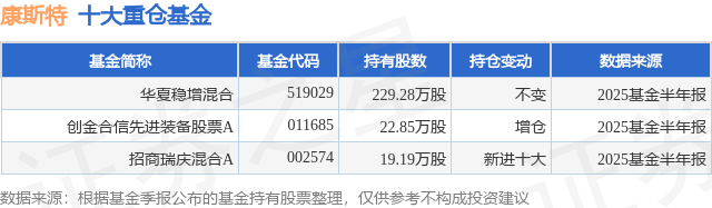 根据2025基金半年报公募基金重仓股数据,重仓该股的公募基金共3家,其中持有数量最多的公募基金为华夏基金的华夏稳增混合。华夏稳增混合目前规模为11.46亿元,最新净值3.179(9月15日),较上一交易日下跌0.19%,近一年上涨88.66%。该公募基金现任基金经理为彭海伟。彭海伟在任的基金产品包括:华夏景气成长一年持有混合发起式A,管理时间为2024年3月28日至今,期间收益率为51.43%。