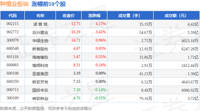 证券之星消息,9月16日种植业板块较上一交易日下跌0.05%,康农种业领跌。当日上证指数报收于3861.87,上涨0.04%。深证成指报收于13063.97,上涨0.45%。种植业板块个股涨跌见下表: