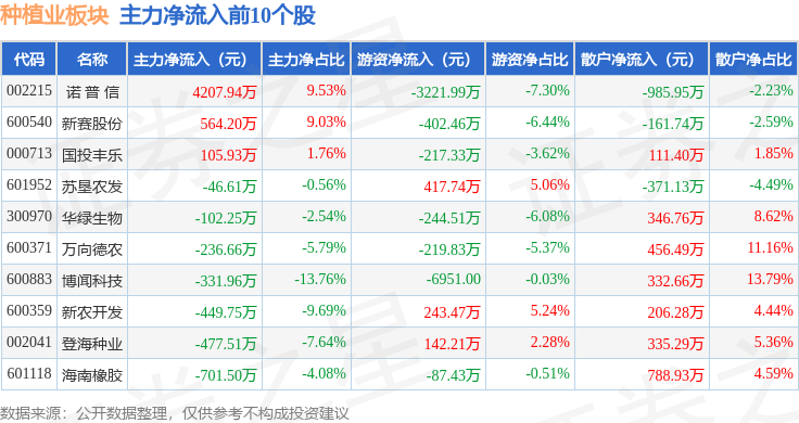 从资金流向上来看,当日种植业板块主力资金净流出1.77亿元,游资资金净流入2036.99万元,散户资金净流入1.56亿元。种植业板块个股资金流向见下表: