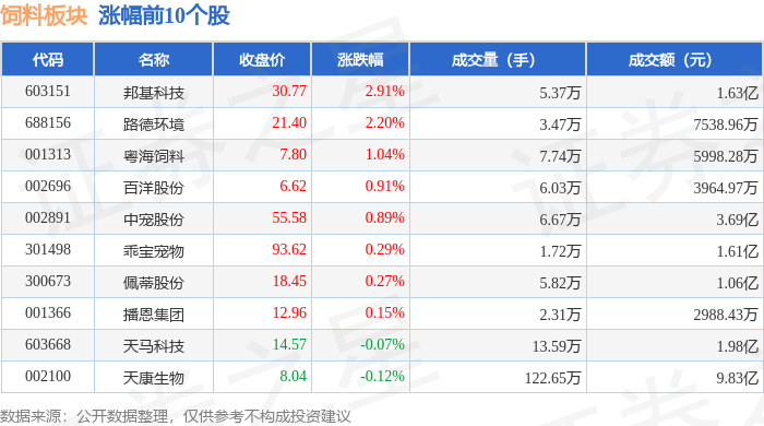证券之星消息,9月16日饲料板块较上一交易日下跌0.95%,傲农生物领跌。当日上证指数报收于3861.87,上涨0.04%。深证成指报收于13063.97,上涨0.45%。饲料板块个股涨跌见下表: