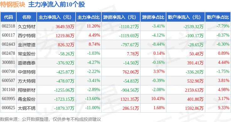 从资金流向上来看,当日特钢板块主力资金净流出6995.81万元,游资资金净流入1091.39万元,散户资金净流入5904.42万元。特钢板块个股资金流向见下表:
