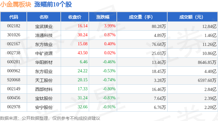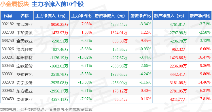 从资金流向上来看,当日小金属板块主力资金净流出47.29亿元,游资资金净流入8.31亿元,散户资金净流入38.98亿元。小金属板块个股资金流向见下表: