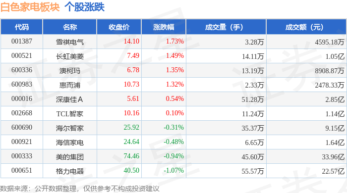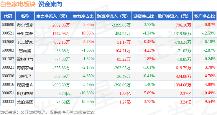 从资金流向上来看,当日白色家电板块主力资金净流出7.89亿元,游资资金净流入2.17亿元,散户资金净流入5.72亿元。白色家电板块个股资金流向见下表: